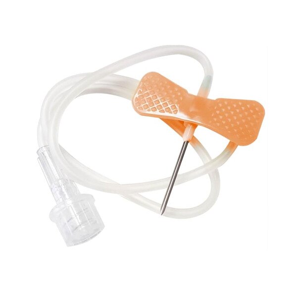 Exel International’s butterfly infusion set, or scalp vein set has a 25g x 3/4in. thin wall stainless steel cannula, that is siliconized for easy insertion. It has a 12in. tube with flexible wings that hold the needle in position and helps to prevent inadvertent pull out. This infusion set has a orange-colored hub for easy identification. Each scalp vein set in this box is latex free and individually packaged.