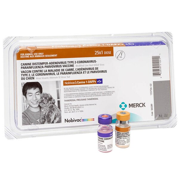 (Merck) 5-way + coronavirus Modified live plus killed coronavirus. For protection against canine distemper, adenovirus type 2 (and hepatitis), parainfluenza, parvovirus and coronavirus. For dogs 6 weeks of age or older. Give 1 ml IM or SQ. Beginning as early as 6 weeks of age, give every 2 to 4 weeks until 12 weeks of age. A minimum of two doses is required for primary immunization. Annual revaccination with a single dose is recommended. Not for pregnant bitches. Requires mixing. Order syringes separately. Nobivac®: Canine 1-DAPPv vaccine is a modified live virus vaccine for the vaccination of healthy dogs as an aid in the prevention of disease caused by canine distemper virus, adenovirus type 1 (hepatitis), adenovirus type 2 (respiratory disease), canine parainfluenza virus, and canine parvovirus. Data indicate the development of corneal opacity is not associated with the use of this product. Nobivac®: Canine 1-Cv vaccine (feline enteric coronavirus) is a killed virus vaccine for the vaccination of healthy dogs as an aid in the prevention of disease caused by canine coronavirus infection.