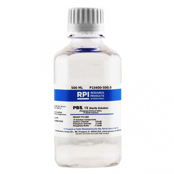 Phosphate Buffered Saline is a buffer solution commonly used in biological research. PBS has many uses because it is isotonic and non-toxic to most cells. These uses include substance dilution and cell container rinsing.Ready to use sterile 1X solution.Ingredients:Sodium Chloride: 137 mMPotassium Chloride: 2.7 mMPhosphate Buffer: 11.9 mMpH: 7.4Does not contain Calcium or Magnesium Common Name: Phosphate Buffered Saline 1X Sterile Solution CAS Number: 7647-14-5, 7447-40-7, 7558-79-4, 7778-77-0, 7732-18-5 Solubility: Water Storage Temperature: Room Temperature Storage Conditions: Room Temperature Appearance: Clear and Colorless Solution pH: 7.25 - 7.55 Country of Origin: USA Shipping Weight: 0.25 lbs Shipping Dimensions: 7.00 x 3.50 x 3.50 Research or further manufacturing use only, not for food or drug use.