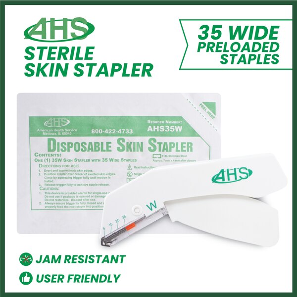 Skin Stapler, Sterile, 35 Wide, AHS35 Wide, Each (0)No Reviews yet Best SellerBest Seller $7.50 Quantity discounts availableQuantityPrice SKU: AHS35W Brand: American Health ServiceUPC: 0718453872166 Item Is In StockCurrent Stock: 24091 Quantity -+ Add to Cart Product Description AHS Skin Stapler, Sterile, with 35 Staples Wide, 35W, Each Product Video Product DescriptionProduct Video Back AHS Skin Stapler, Sterile, with 35 Staples Wide, 35W, Each Back Reviews 0 Back Ratings & ReviewsNo reviews availableBe the first to Write a Review